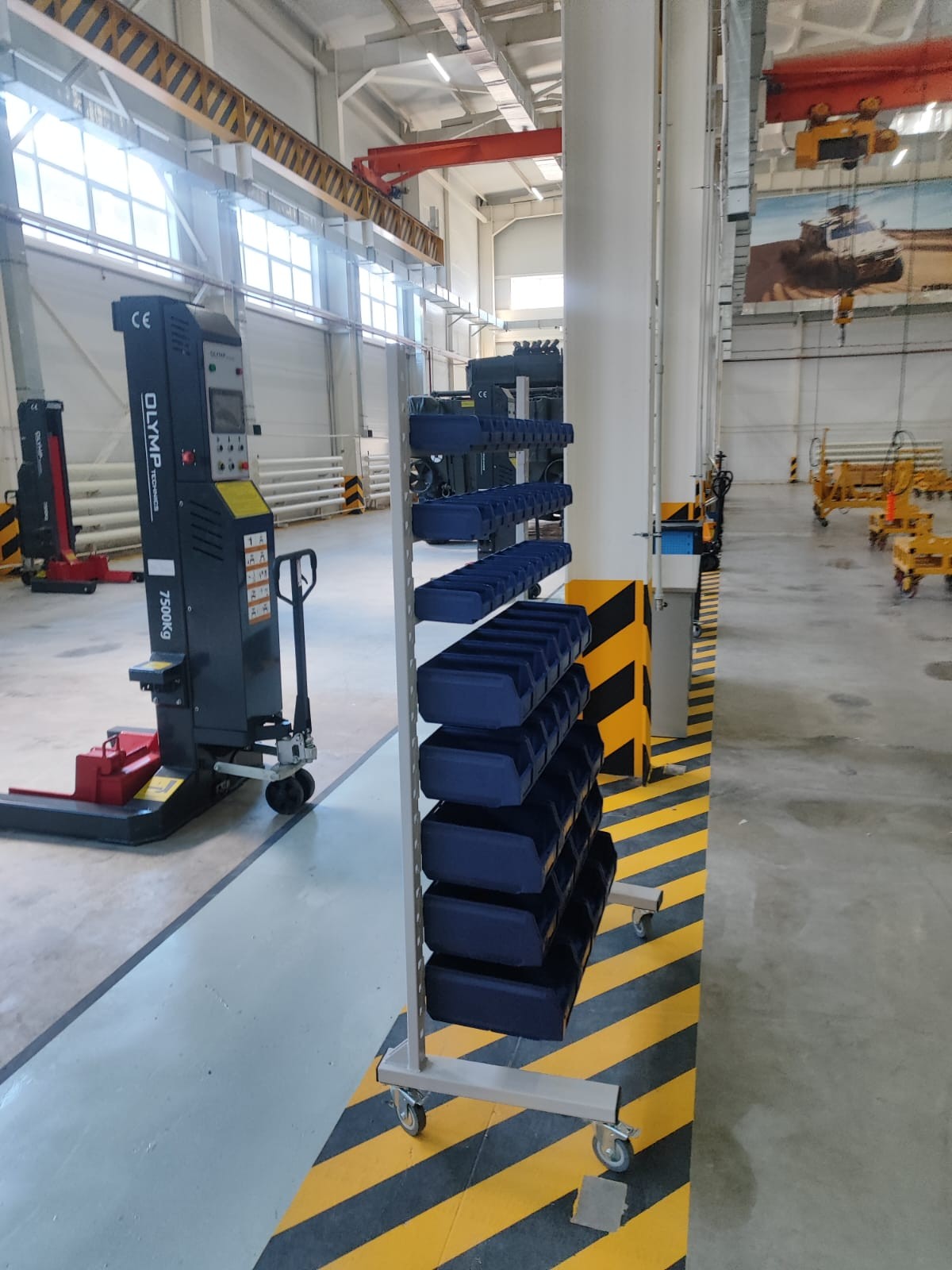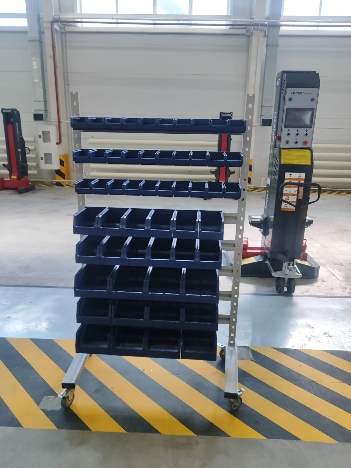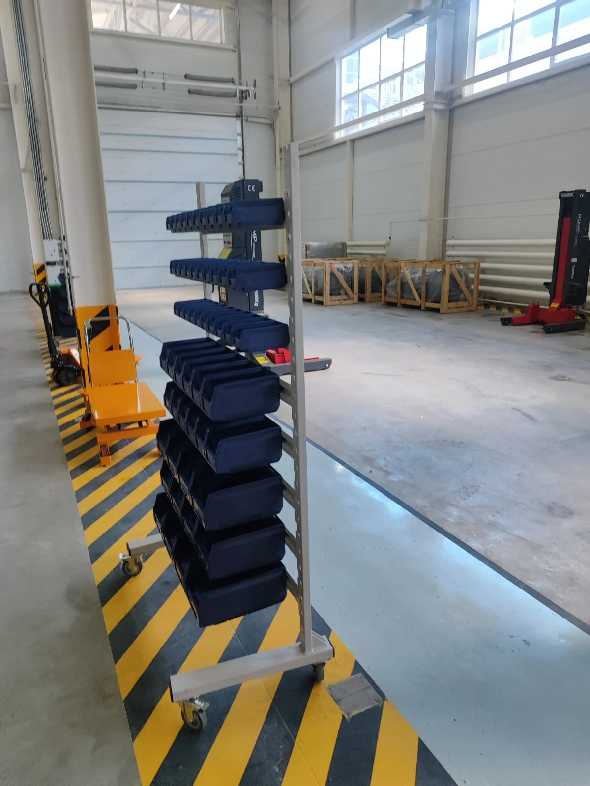 На фото – один из реализованных проектов: мобильный стеллаж на колёсах с пластиковыми ячейками для хранения мелких деталей. Конструкция адаптирована под конкретные задачи клиента — удобная организация пространства, мобильность и прочность в одном решении.
